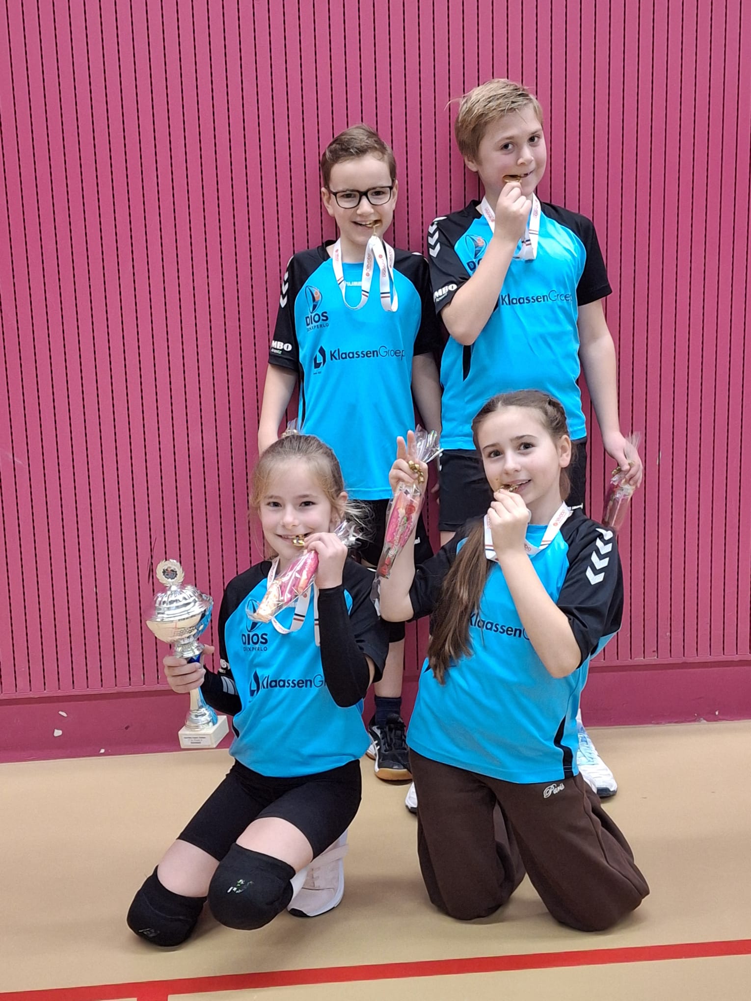 Ook bij het CMV, het competitieformat voor de jongste jeugd, was het feest. Op niveau 2 werden zowel team 1 als team 2 kampioen, op niveau 3 mocht team 1 zich de beste noemen en op niveau 4 was het team 1 dat uiteindelijk de titel binnen sleepte. Vooral bij dat laatste team was het tot het eind spannend, maar Sophie, Daan, Dide en Noud trokken aan het langste eind en mogen zich de trotse winnaars noemen (zie foto).